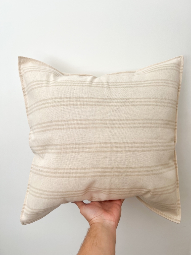 Almohadón 50x50 confeccionado en tusor tramado color natural con rayas arena. Relleno de vellón siliconado, súper cómodo y suave.