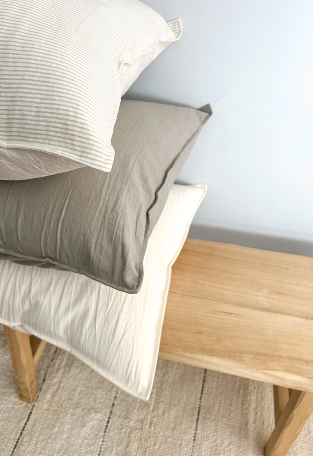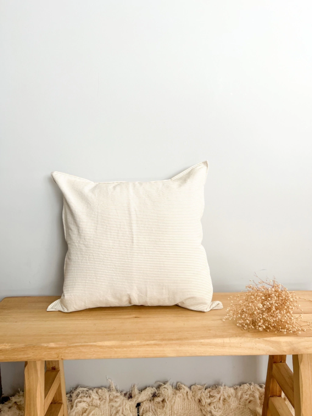 Almohadón 50x50 confeccionado en tusor rayado natural y arena. Relleno de vellón siliconado, súper cómodo y suave.
