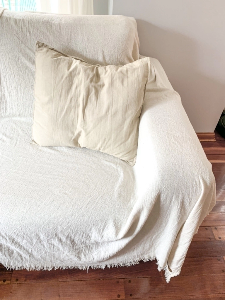 Manta tejida a telar 100% algodón, con terminación desflecada en sus extremos.