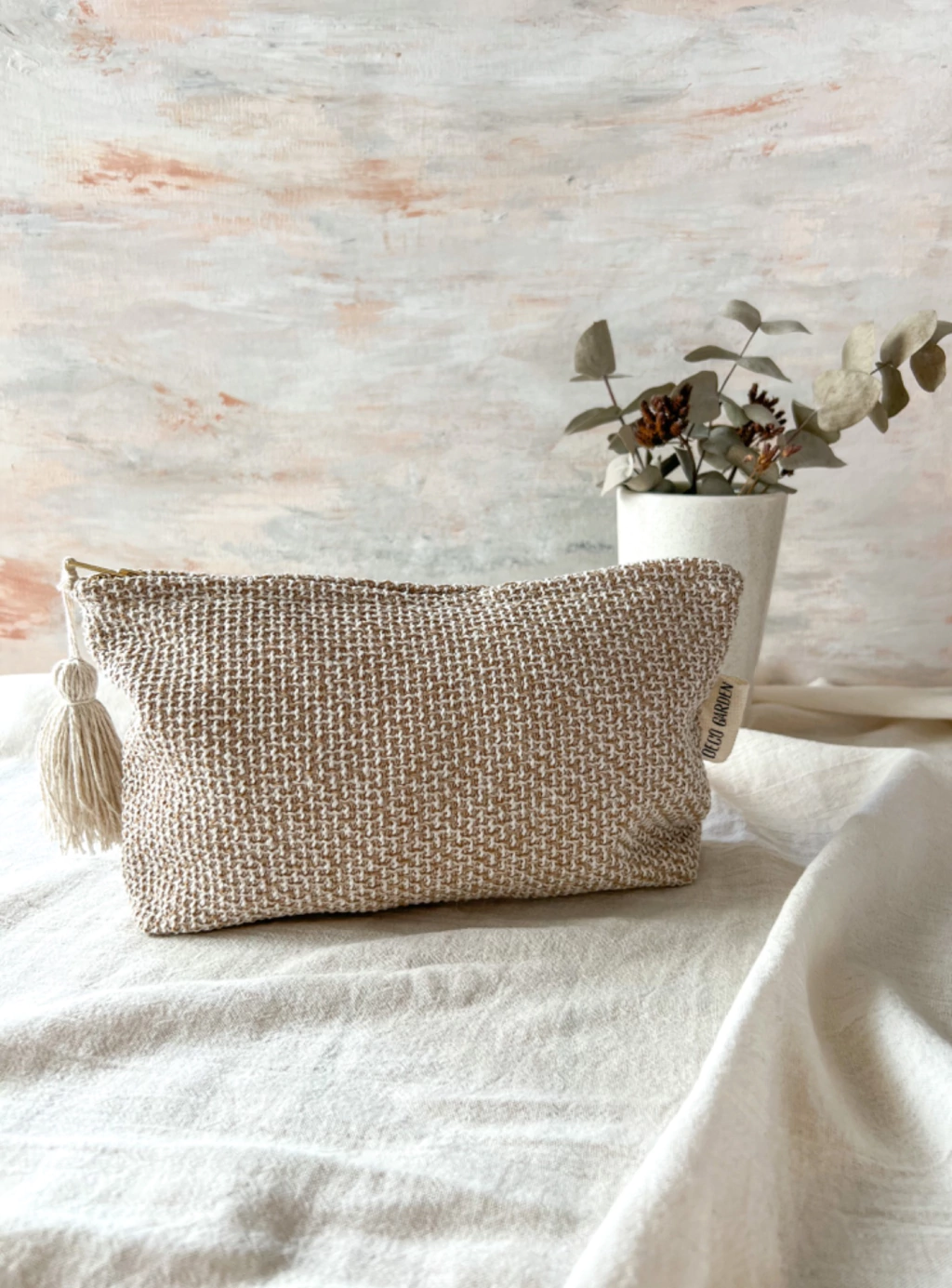 Neceser en textil tramado color tostado y natural, forrado completamente en tusor. Cierre metalico dorado con tiracierres de borla.