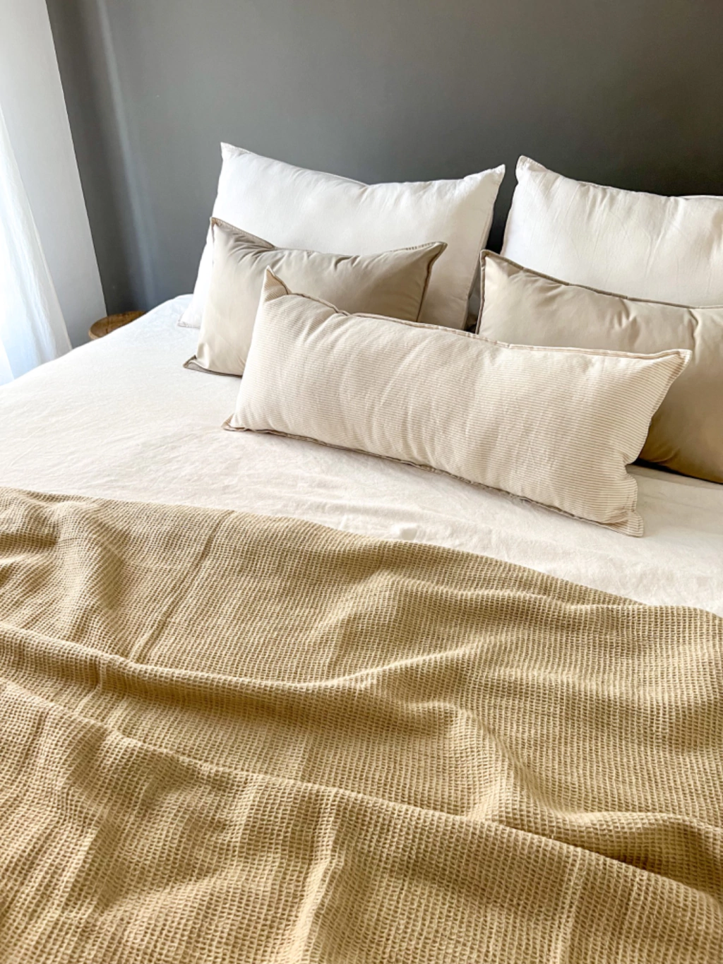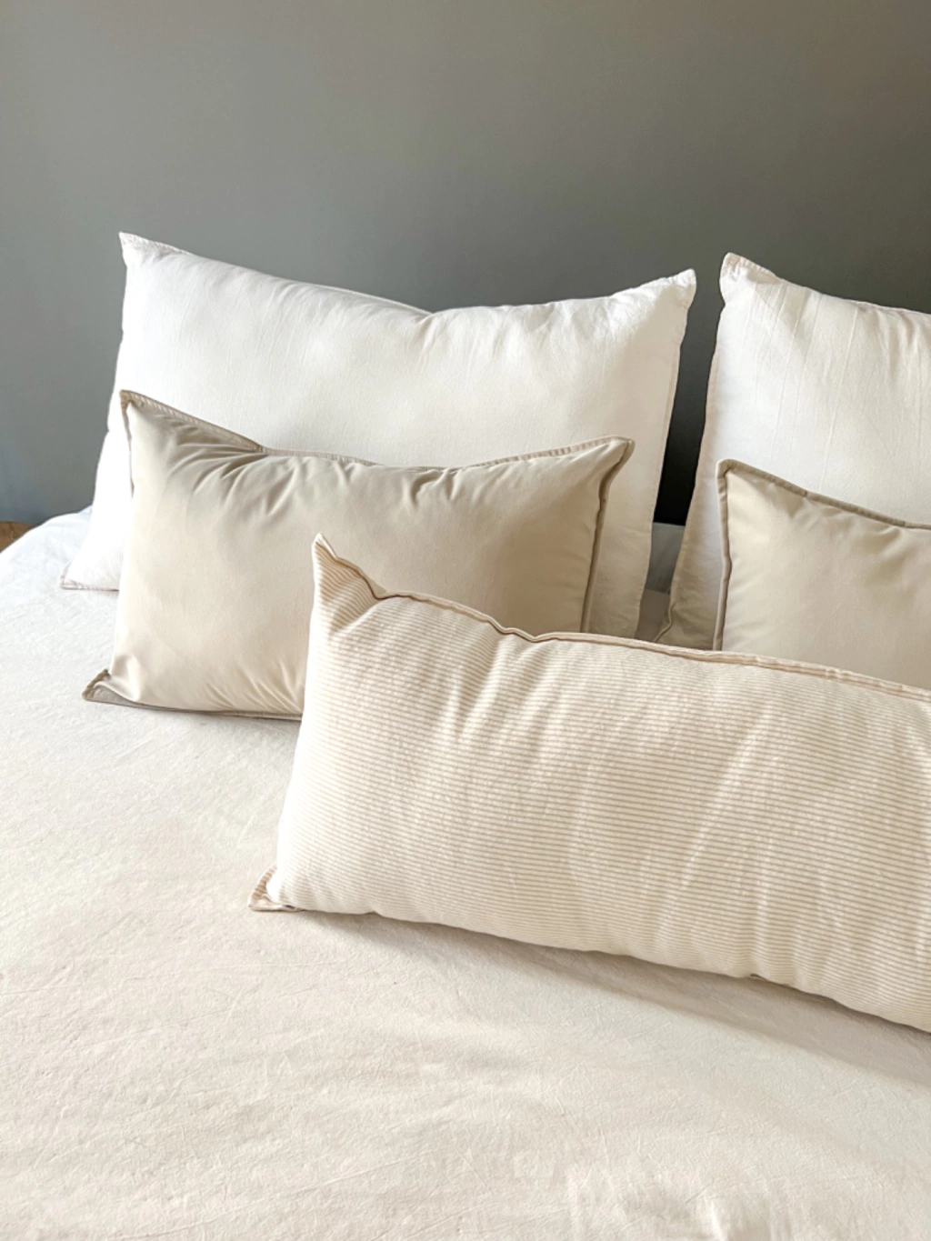 El pack incluye 2 almohadónes 55x80 en tusor natural, 2 almohadones 40x60 en terciopelo arena y un algodón 35x80 mil rayas arena. Relleno en vellón siliconado súper soft. Las fundas se pueden retirar para lavar.