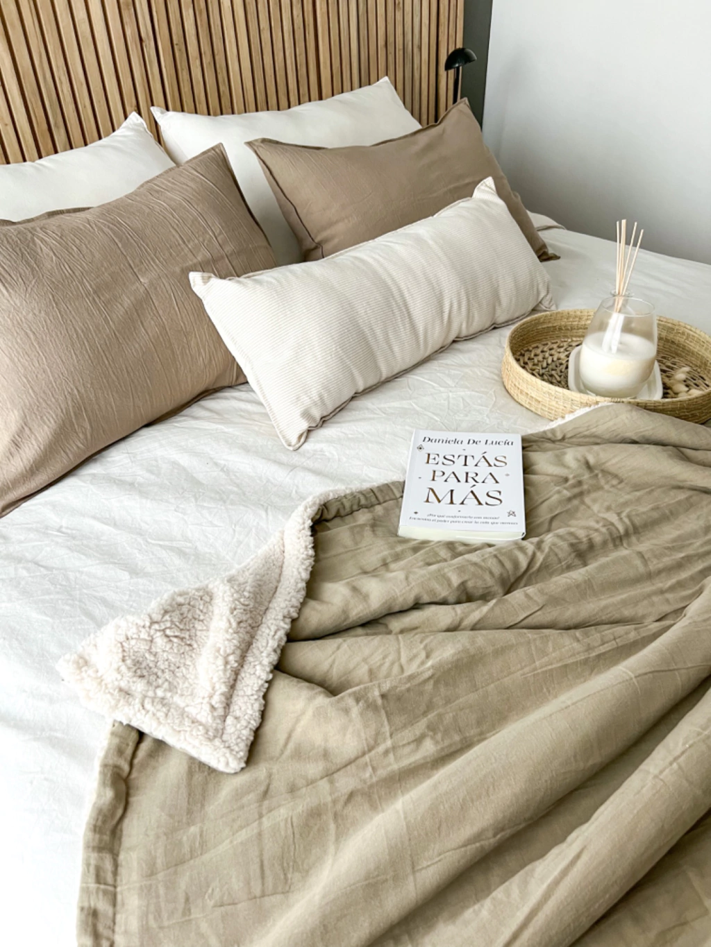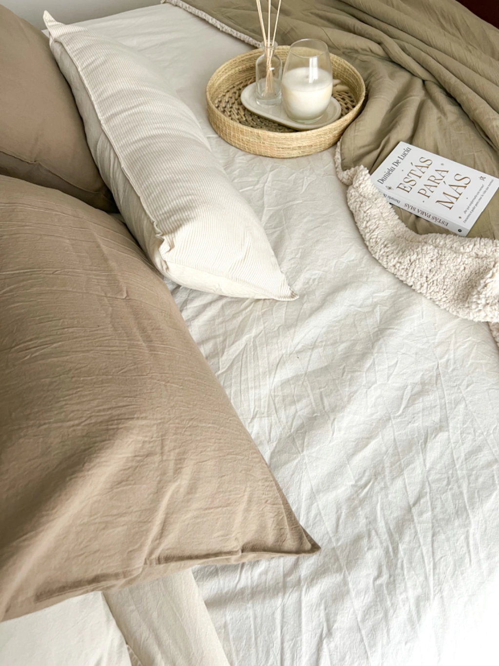 El pack incluye 2 almohadónes 55x80 en tusor natural, 2 almohadones 50x70 en tusor tostado y un almohadón 35x80 mil rayas arena. Relleno en vellón siliconado súper soft. Las fundas se pueden retirar para lavar.