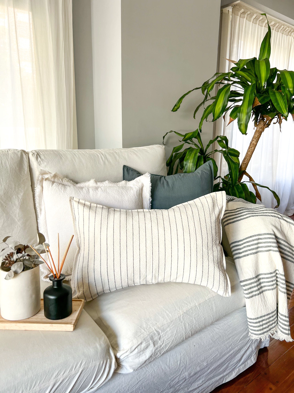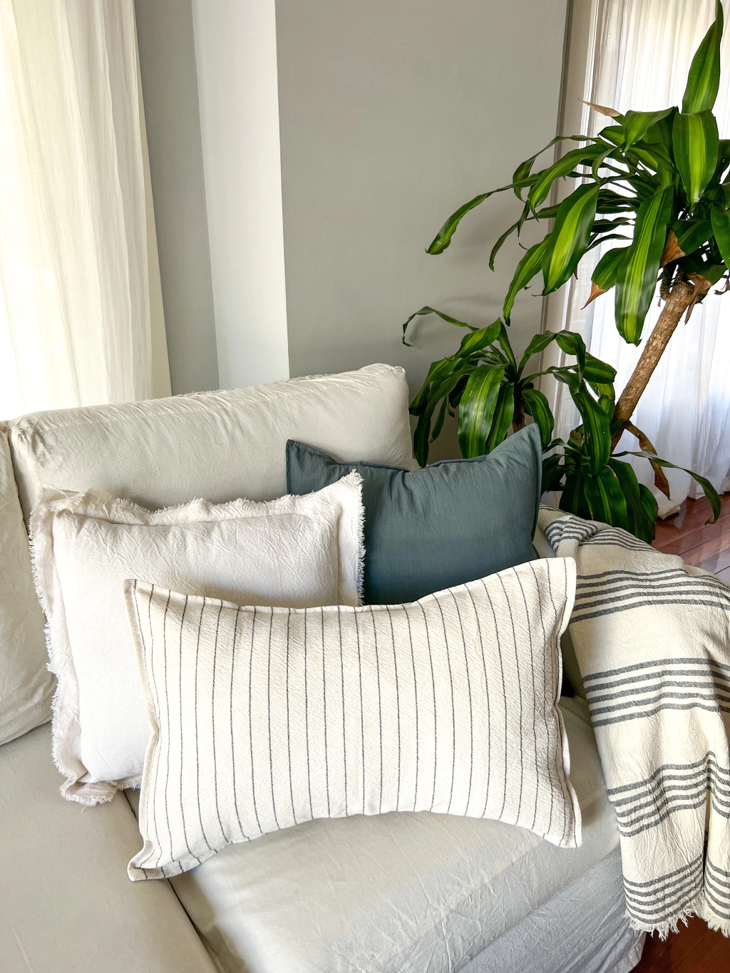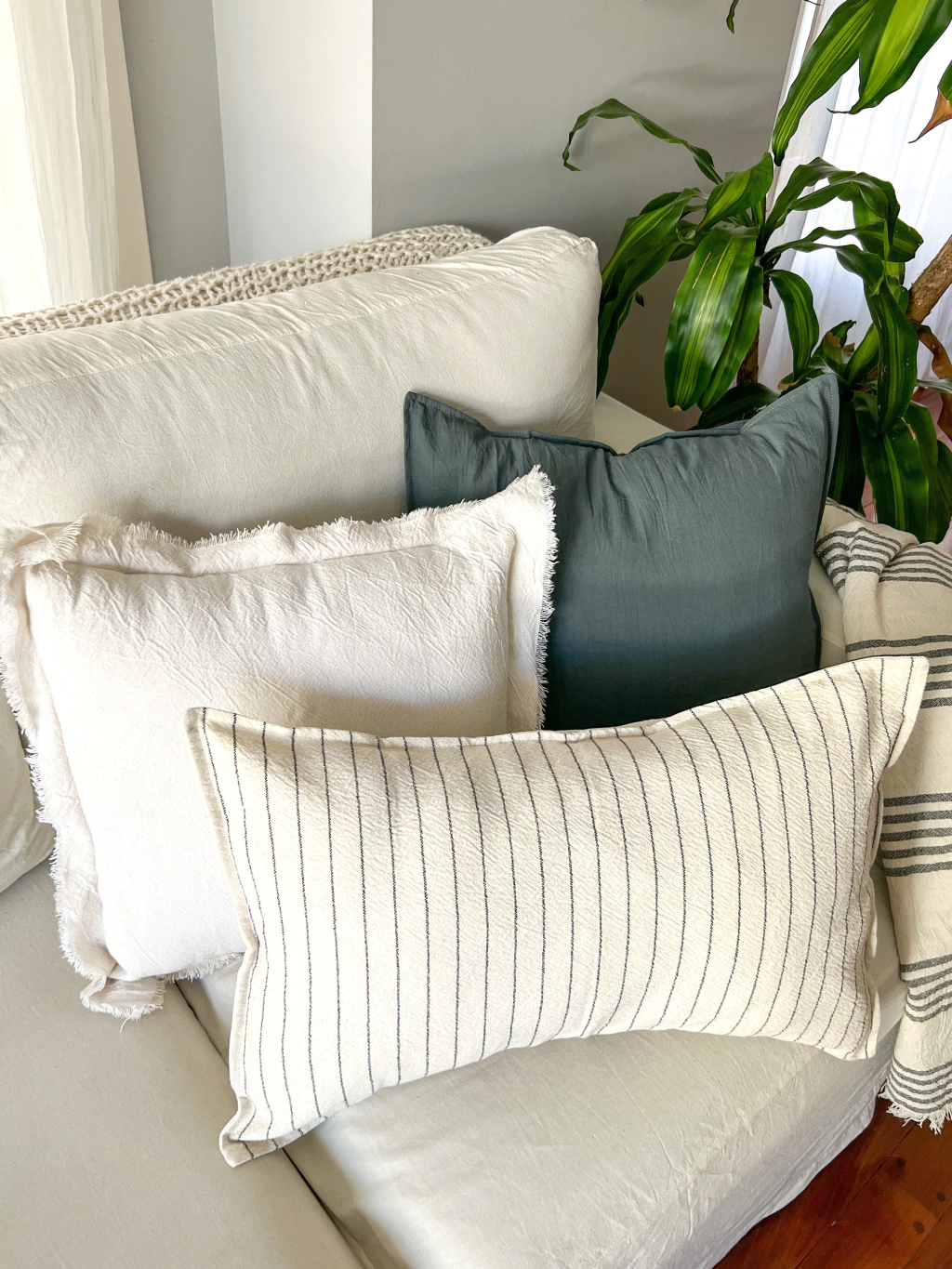 Este pack es ideal para renovar tu sillon! Incluye 1 almohadón Cali 50x50 en tusor gris tipo, 1 almohadón desflecado Holbox natural 50x50 y 1 almohadón 40x60 rayado Roma natural y grafito.